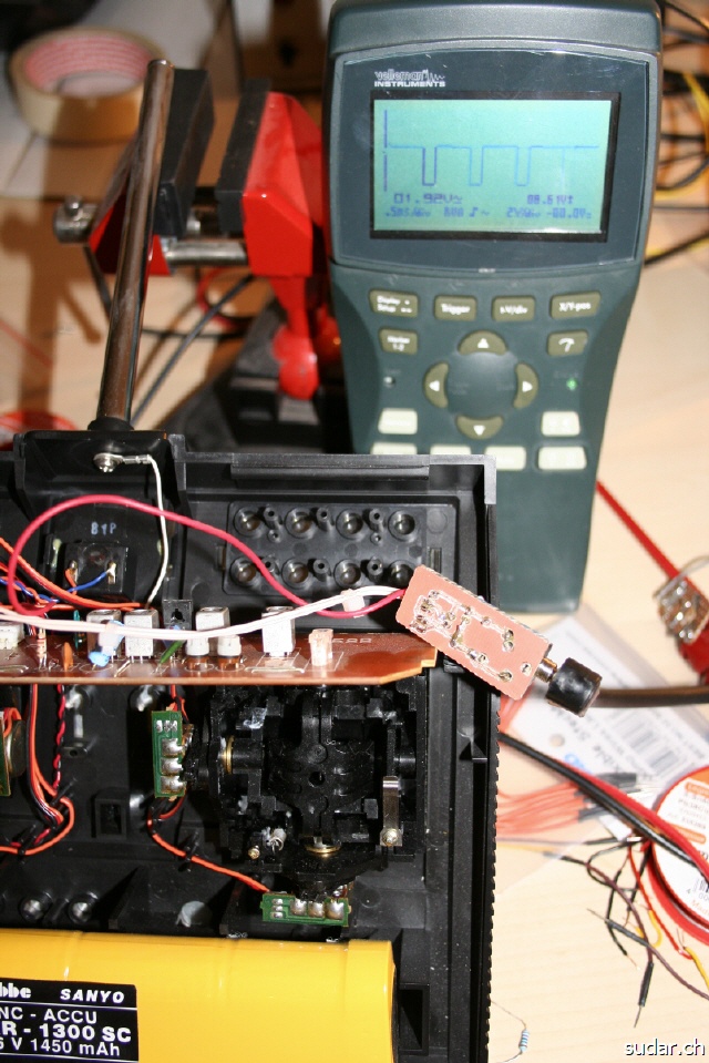 Da ich ein "Mode1" Flieger bin und meine meisten Freunde mit ihren Fernsteuerungen "Mode2" fliegen, wollte ich noch zusätzlich zu meiner Graupner MC17, welche ich als "Mode1" Schülersender benutze, eine alte Futaba F14 zum "Mode2" Schülersender umbauen. Leider stellte sich rasch heraus, dass der Sender ein sehr schwach moduliertes Signal ausgibt, welches so nicht direkt als Schülersignal ausgewertet werden konnte! Ich baute mir eine kleine Schülerbuchse mit integriertem Verstärker. Dies war auch mein erster Versuch, eine Platine mit meiner ersten CNC zu fräsen.